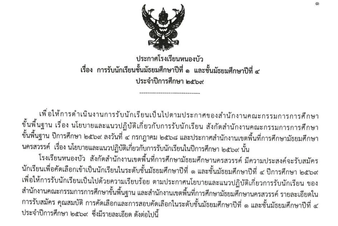 ประกาศโรงเรียนหนองบัว เรื่อง การรับนักเรียนชั้นมัธยมศึกษาปีที่ 1 และชั้นมัธยมศึกษาปีที่ 4 ประจำปีการศึกษา 2569